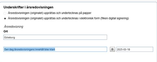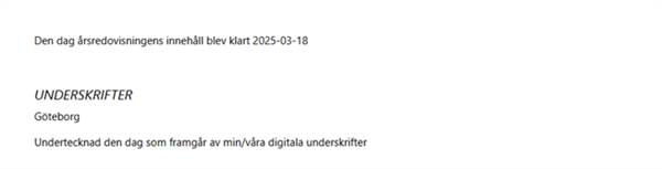 Du har nu även möjlighet att ändra texten för årsredovisningens avgivande. Standardtexten "Den dag årsredovisningens innehåll slutligen bestämdes" har ni användare önskat ändra till annan lydelse. Vi har i denna version gjort den rutan redigeringsbar och återställningsbar. Återställsknappen under underskrifter återställer nu texten för årsredovisningens avgivande också.