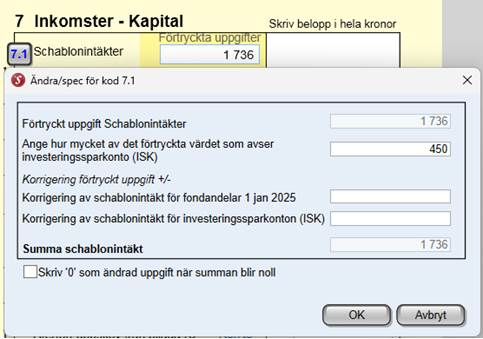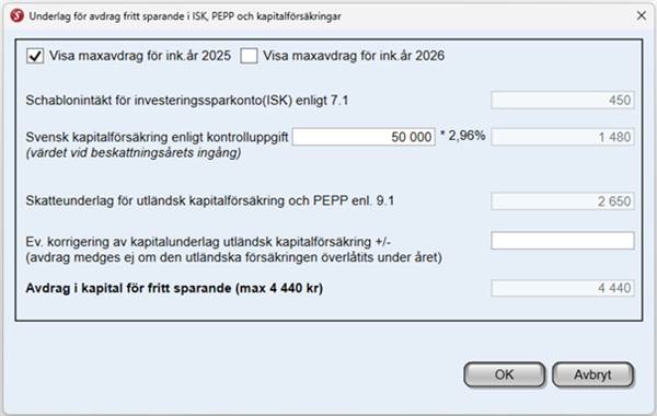 Ännu en nyhet för inkomstår 2025 är att du kan skattefritt ha ett sparande på upp till 150 000 kr i investeringssparkonto (ISK), Pepp-produkt samt kapitalförsäkringar (både svenska och utländska). Rent praktiskt kommer du i skatteberäkningen att få ett avdrag i kapital om max 4 440 kr som motsvarar 150 000 kr * 2,96 %. För att hantera detta avdrag så har vi behövt lägga in att du måste fylla i hur mycket av dina schablonintäkter vid avsnitt 7.1 i kapital som avser investeringssparkonto (ISK). Fyll i 0 om det är noll för att slippa vår nya deklarationskontroll.