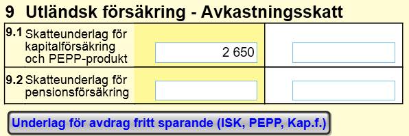 Har du sparande i en svensk kapitalförsäkring och ett sparande på under 4 440 kr summerat på ISK samt skatteunderlag för utländsk kapitalförsäkring samt Pepp-produkt, då behöver du också gå under knappen Underlag för fritt sparande (ISK, PEPP, Kap.f) och tala om hur mycket du har i sparande i svensk kapitalförsäkring för att få korrekt skatteberäkning i BL Skatt.